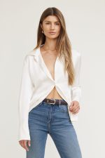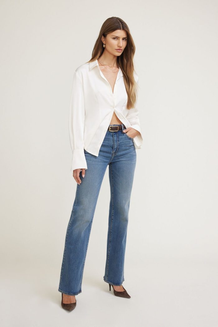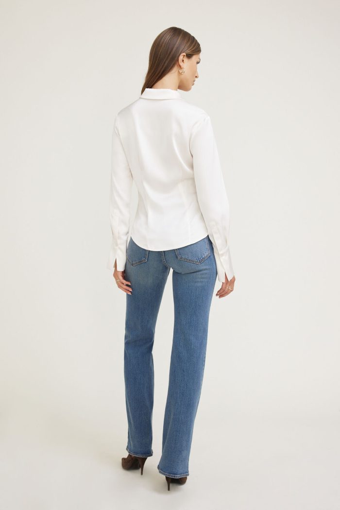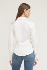 This shirt is made from flowy, silky satin that’s super soft to the touch with just a bit of stretch to move with you. It’s designed for a fitted silhouette and has large cuffs for a little flare. Style it with pants for an in-office look or with a skirt for cocktail hour.